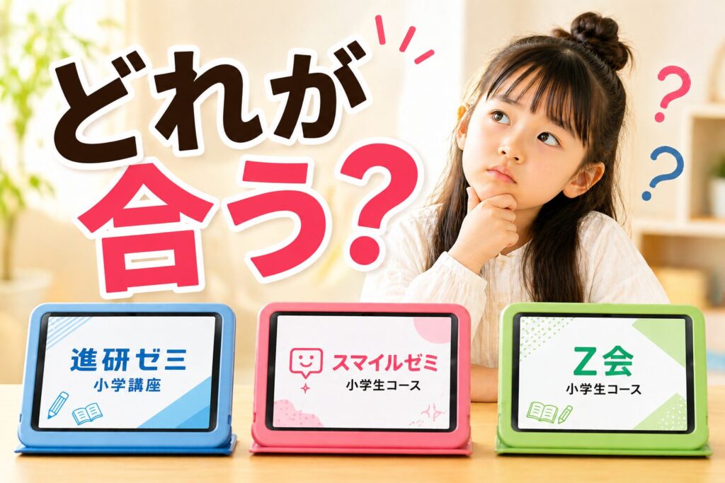 進研ゼミ・スマイルゼミ・Z会の3社を実際に使った経験から徹底比較。料金・特徴・向き不向きを解説し、勉強が続かない小学生にぴったりの通信教育の選び方をお伝えします。 -